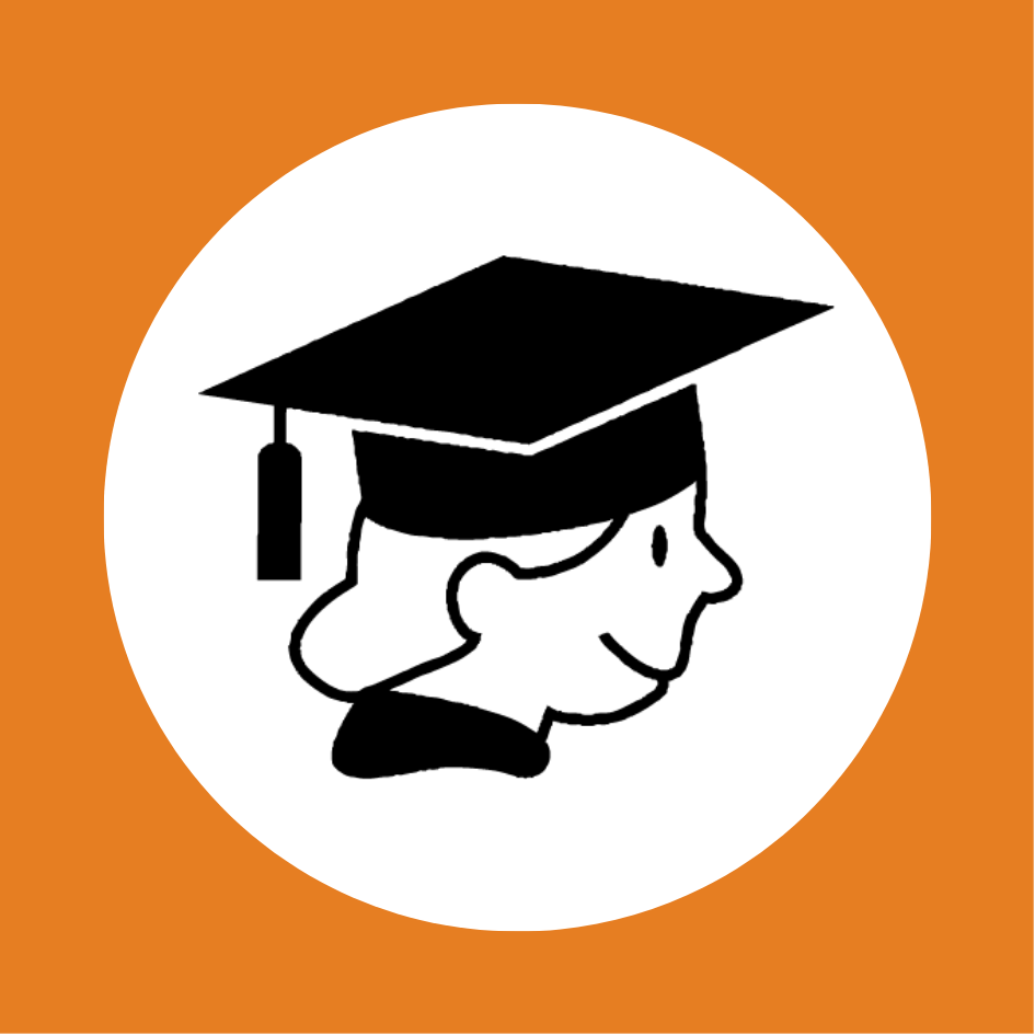 Ikone für Seminar-Angebote: Profilansicht eines lächelnden Gesichts mit einem schwarzen Doktorhut auf weißem Kreis, orangefarbener Hintergrund.